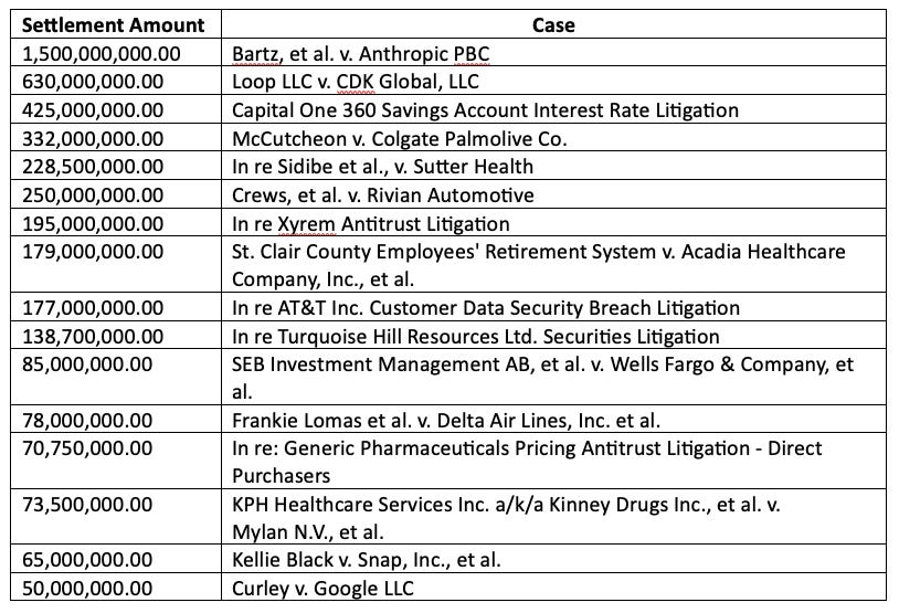 Largest Class Action Settlements of 2025And the plaintiff firms' slice of the pie.Psyche CastillonFeb 02, 2026∙ PaidShareThe largest settlements announced in 2025 include:Source: Class Action ReporterClass Action Updates is reader-supported. To receive new posts, be a paid subscriber.SubscribeContinue reading this post for free, courtesy of Class Action Updates.Claim my free postOr purchase a paid subscription.PreviousNext